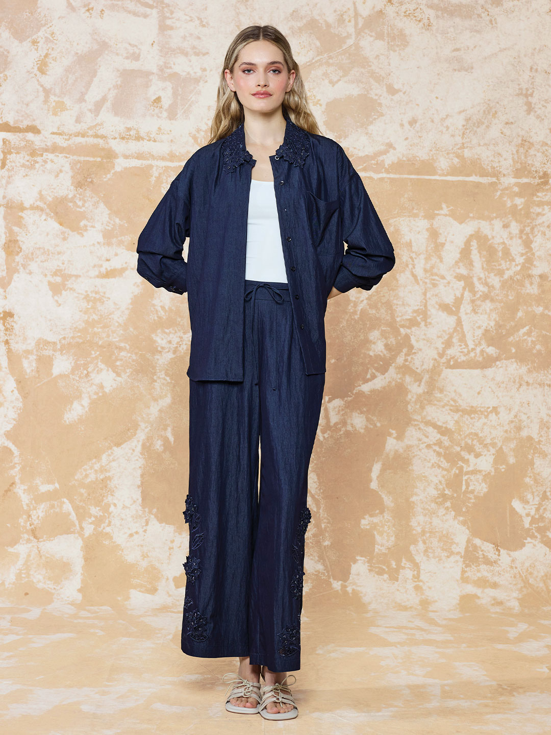 DENİM KUMAŞ YAKASI NAKIŞ DETAYLI GÖMLEK
