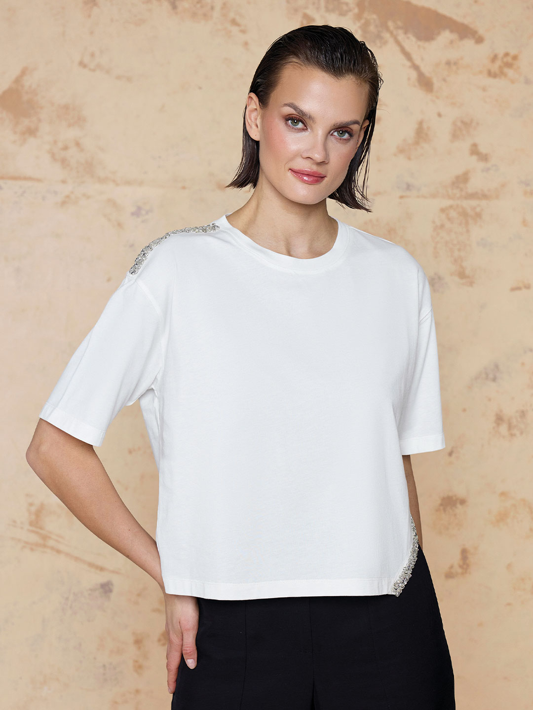 ASİMETRİK KESİM ETEK UCU TAŞ DETAYLI TİŞÖRT