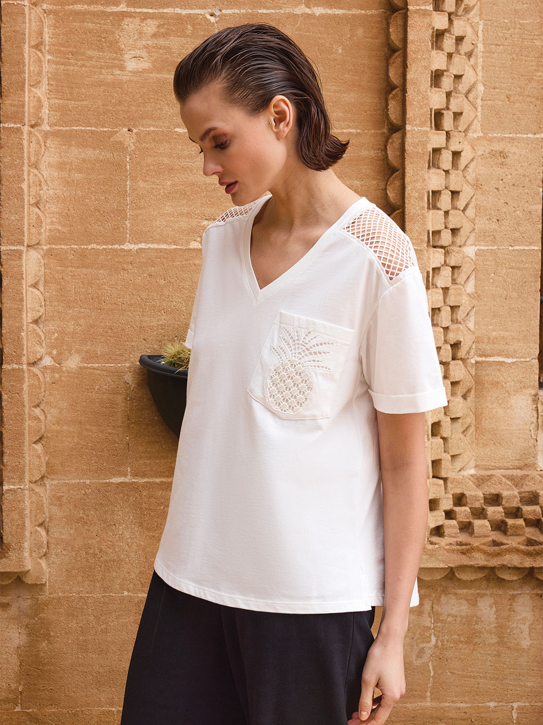 V YAKA ANANAS NAKIŞ İŞLEMELİ TİŞÖRT