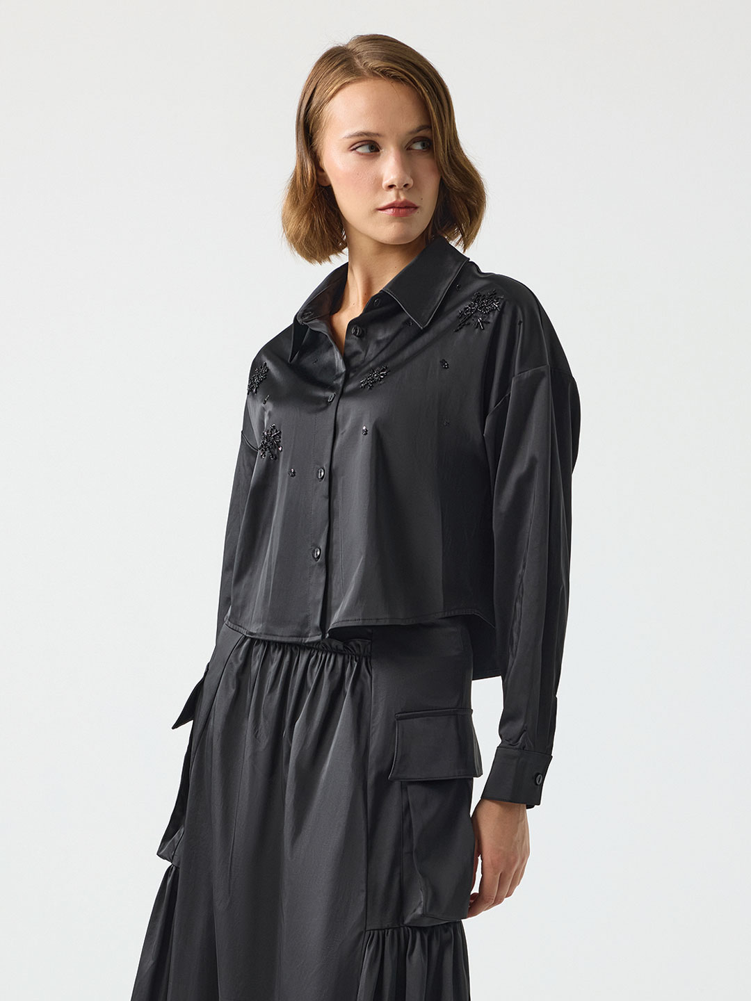 NAKIŞ DETAYLI KISA DERİ GÖMLEK